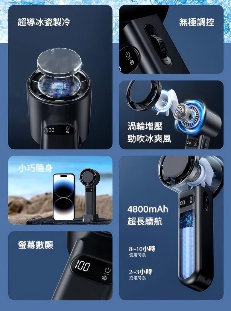 採用渦輪增壓設計,100 段無極風,每分鐘13000 轉,冷敷降溫,吹出冰爽風,令你享受冰鎮快感。