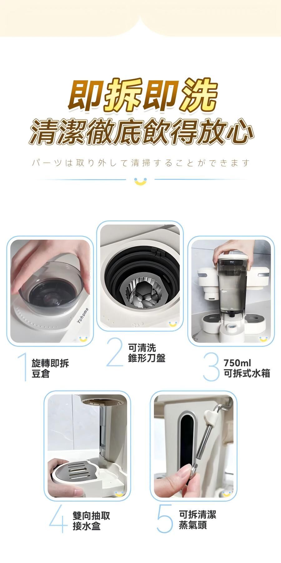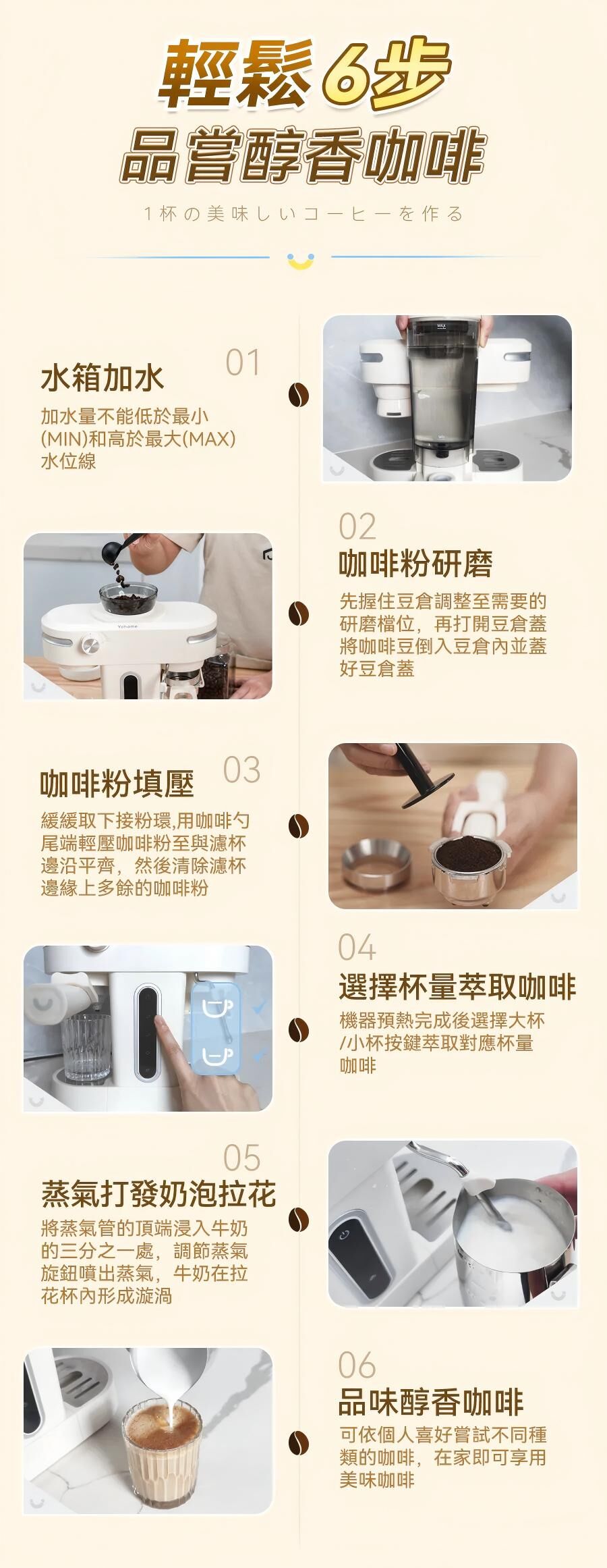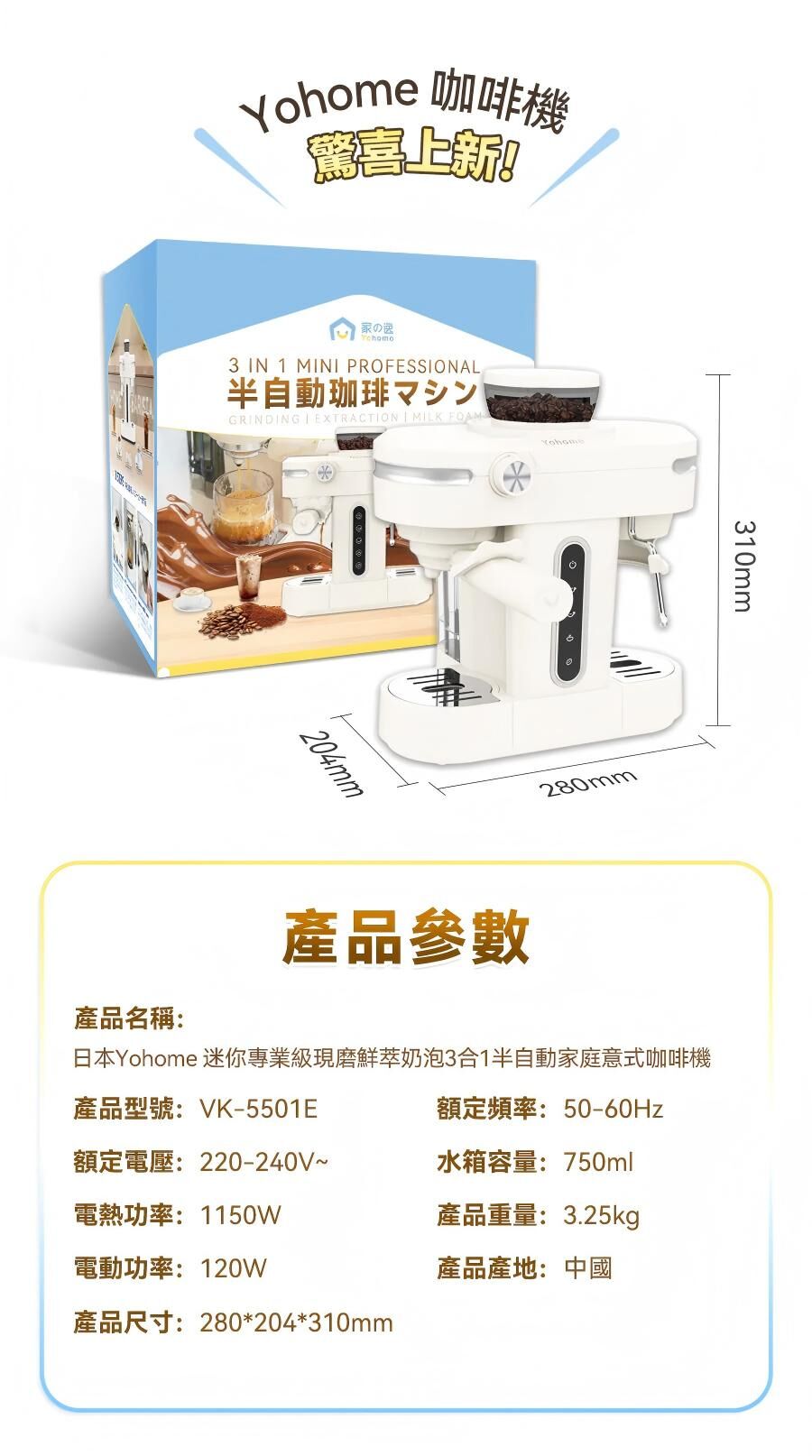 日本Yohome 迷你專業級現磨鮮萃奶泡3合1半自動家庭意式咖啡機