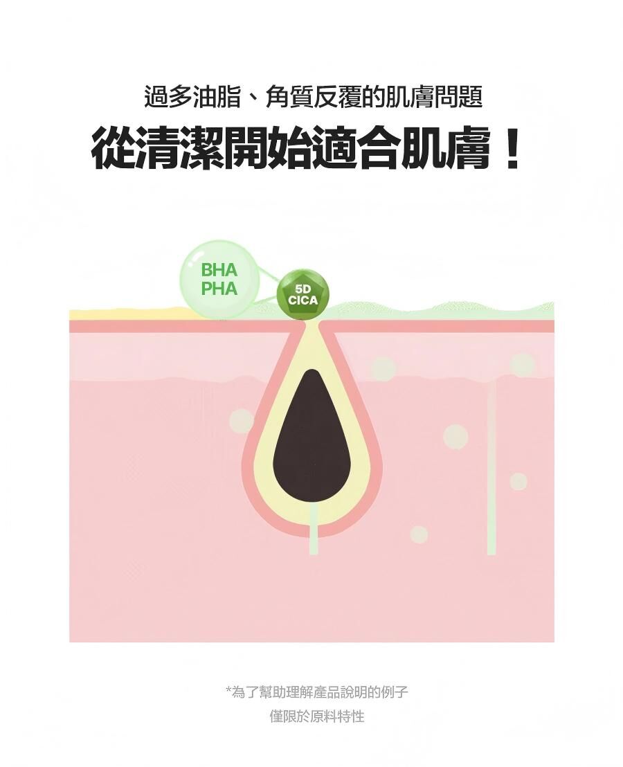 BHA 有助於緩解痤瘡皮膚及PHA 有助於去除皮脂和死皮細胞。