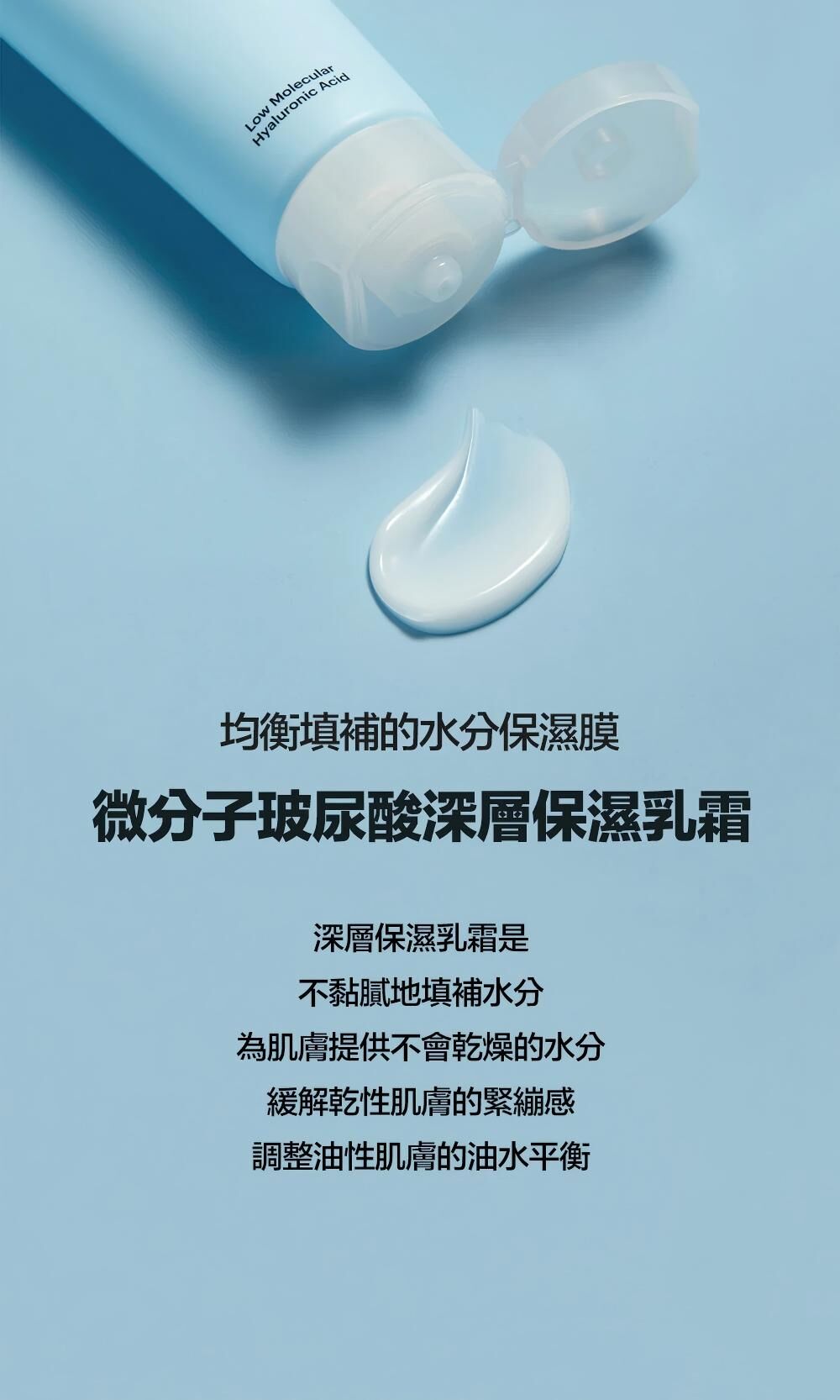 深層保濕乳霜以5種多元微分子玻尿酸為肌膚提供大量水分,預防肌膚水分流失。
